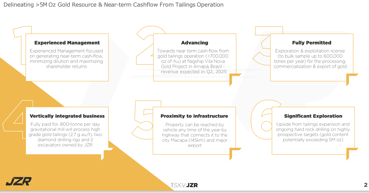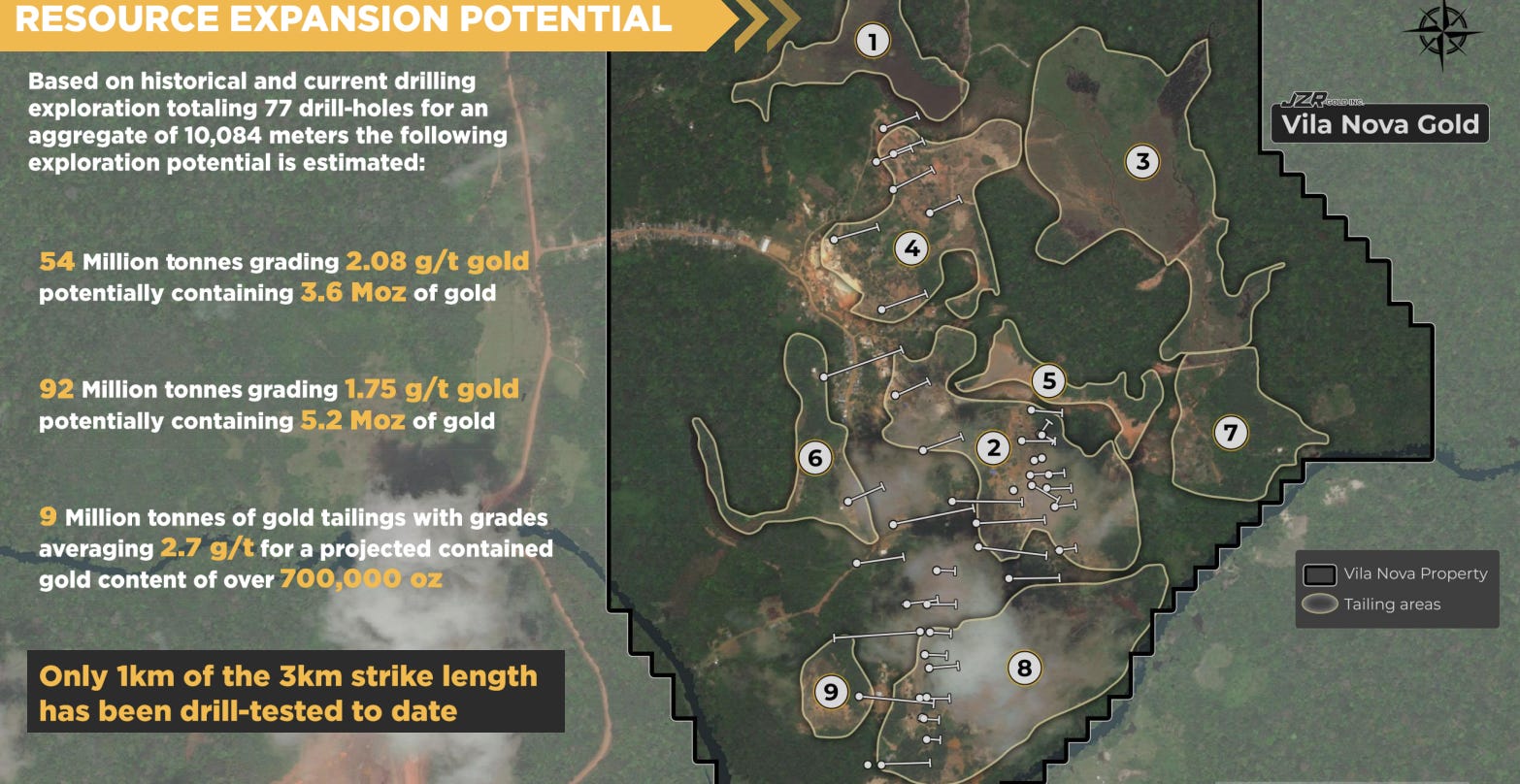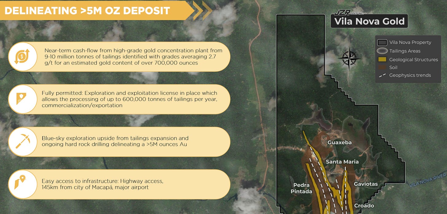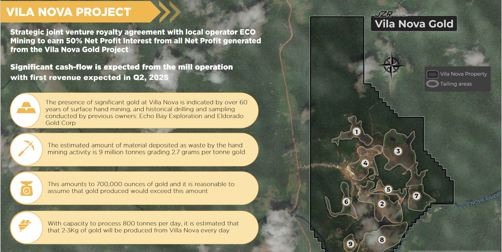 Vila Nova hosts 9 million tonnes of tailings and JZR Gold Inc. envisions an 800 tonne per day mill.